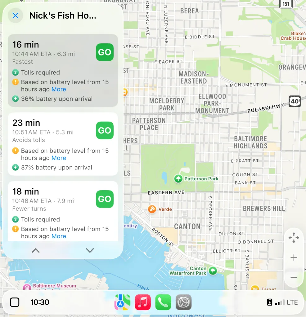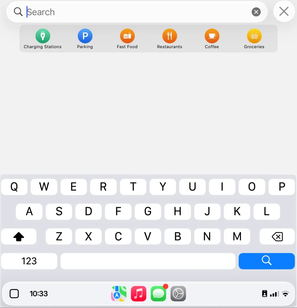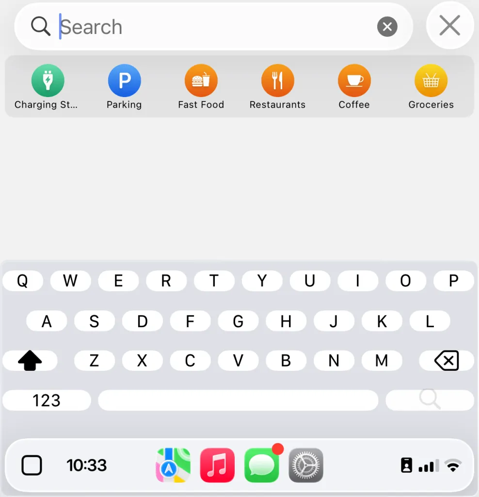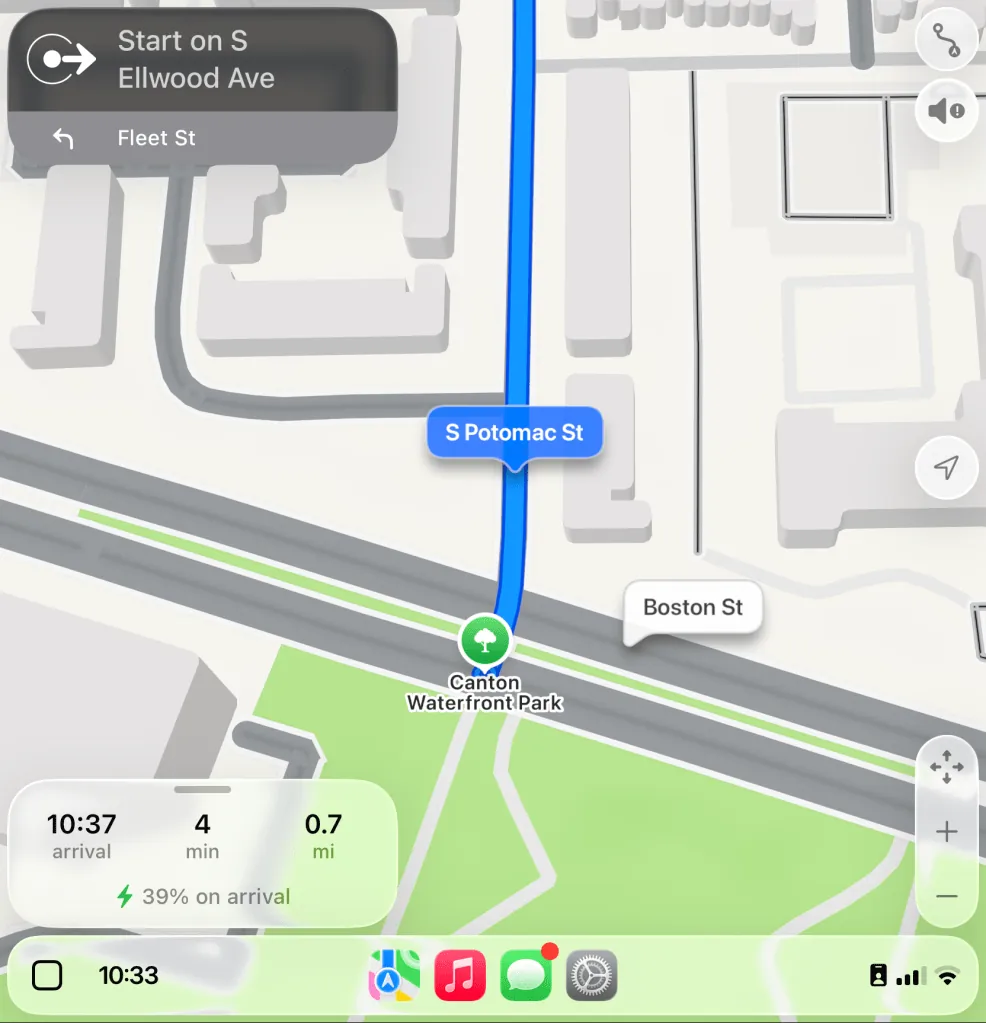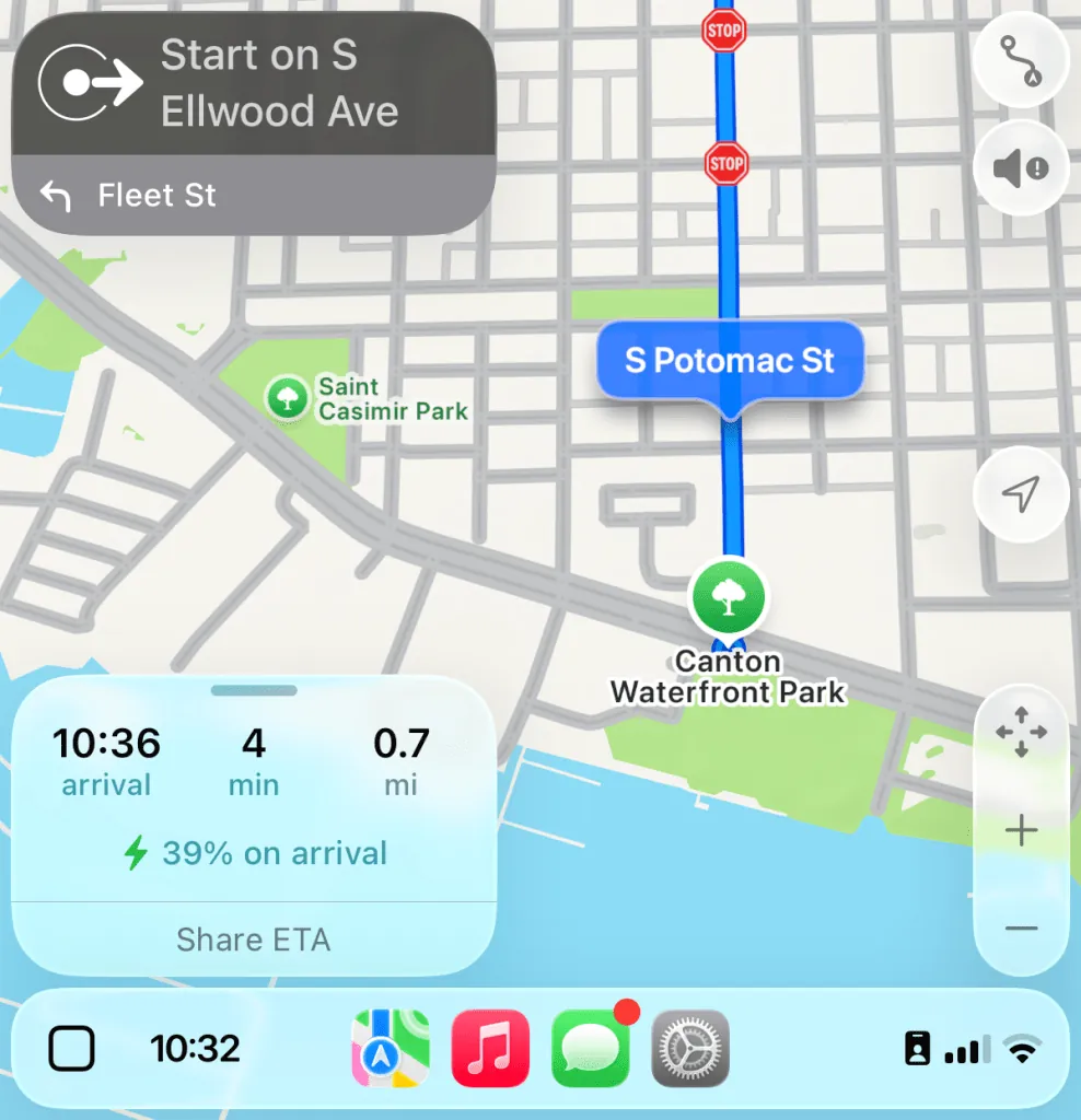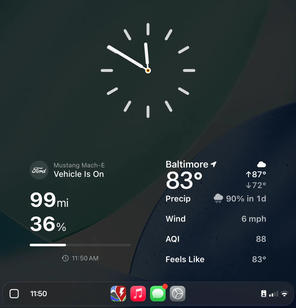スマートディスプレイズーム機能が有効になっている場合と無効になっている場合の、従来のCarPlayユーザーインターフェース要素の外観を示すスクリーンショットをいくつかご紹介します。これらのスクリーンショットは、私の2022年型フォード・マスタング・マッハEで撮影したものです。
