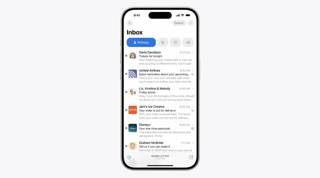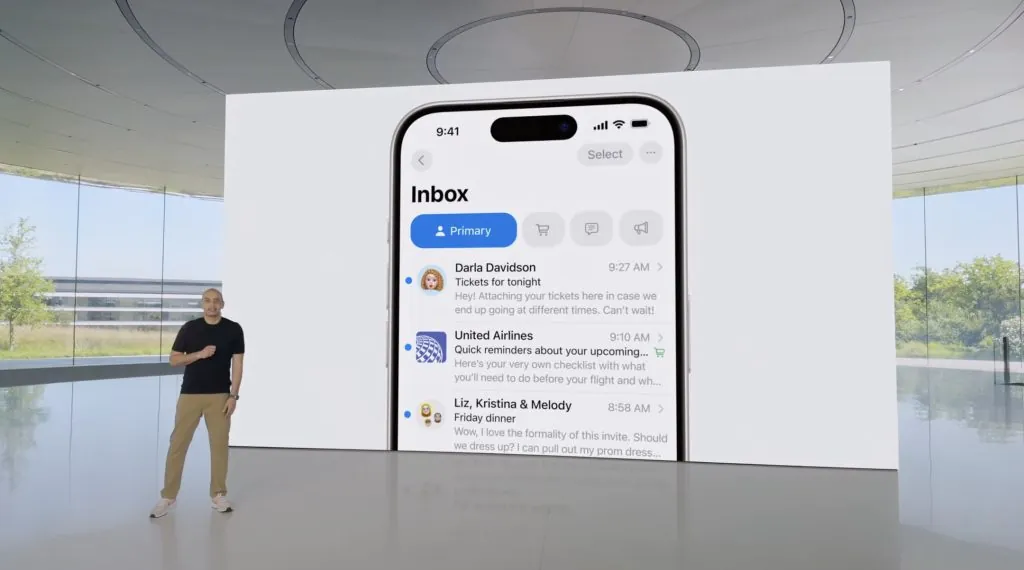 - メール アプリ: 自動分類、デバイス上で完全に処理されます。